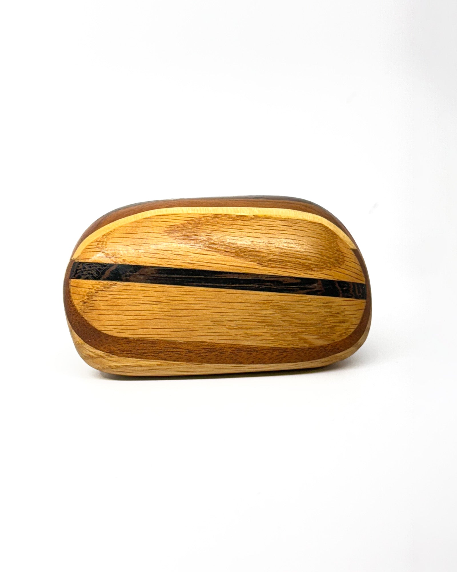 Inspired by the smooth, organic forms of tumbled river stones, Jim Bradshaw’s segmented wood sculptures bring together multiple hardwoods in layered harmony. Each piece is carefully shaped and polished to highlight the natural grain, tone, and texture of the wood, resulting in a surface that feels both timeless and contemporary.