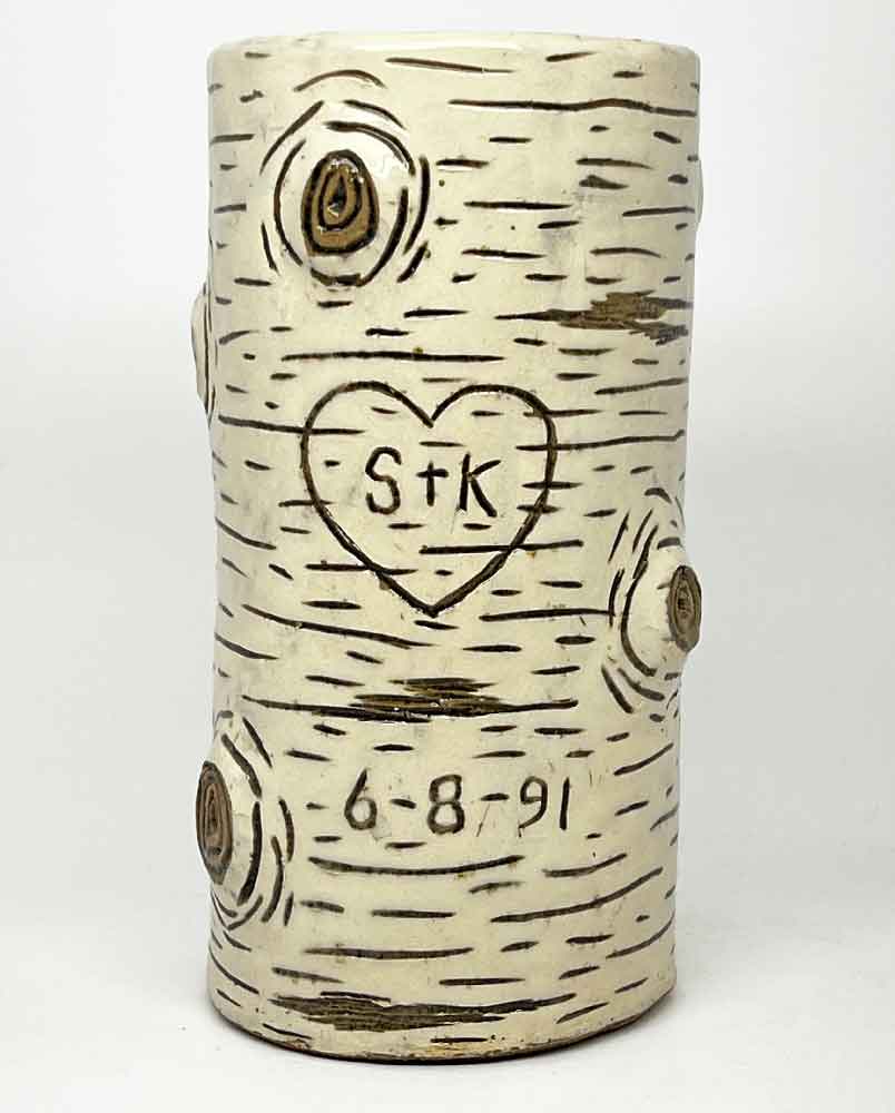 Like every piece Tony Guido creates, each custom order is hand-carved and truly one of a kind. Personalize his aspen-inspired ceramics with names, initials, dates, or Bible verses, transforming functional pottery into a keepsake to treasure. Whether you’re celebrating a wedding, anniversary, or special milestone, Tony’s custom pieces bring both artistry and heartfelt meaning. If you don’t see the form you’d like, please call—we’re happy to help with special requests. Please allow 4–6 weeks for customization. As a thoughtful finishing touch, the bottom of every piece bears Tony’s signature alongside a verse from Psalms or Proverbs.