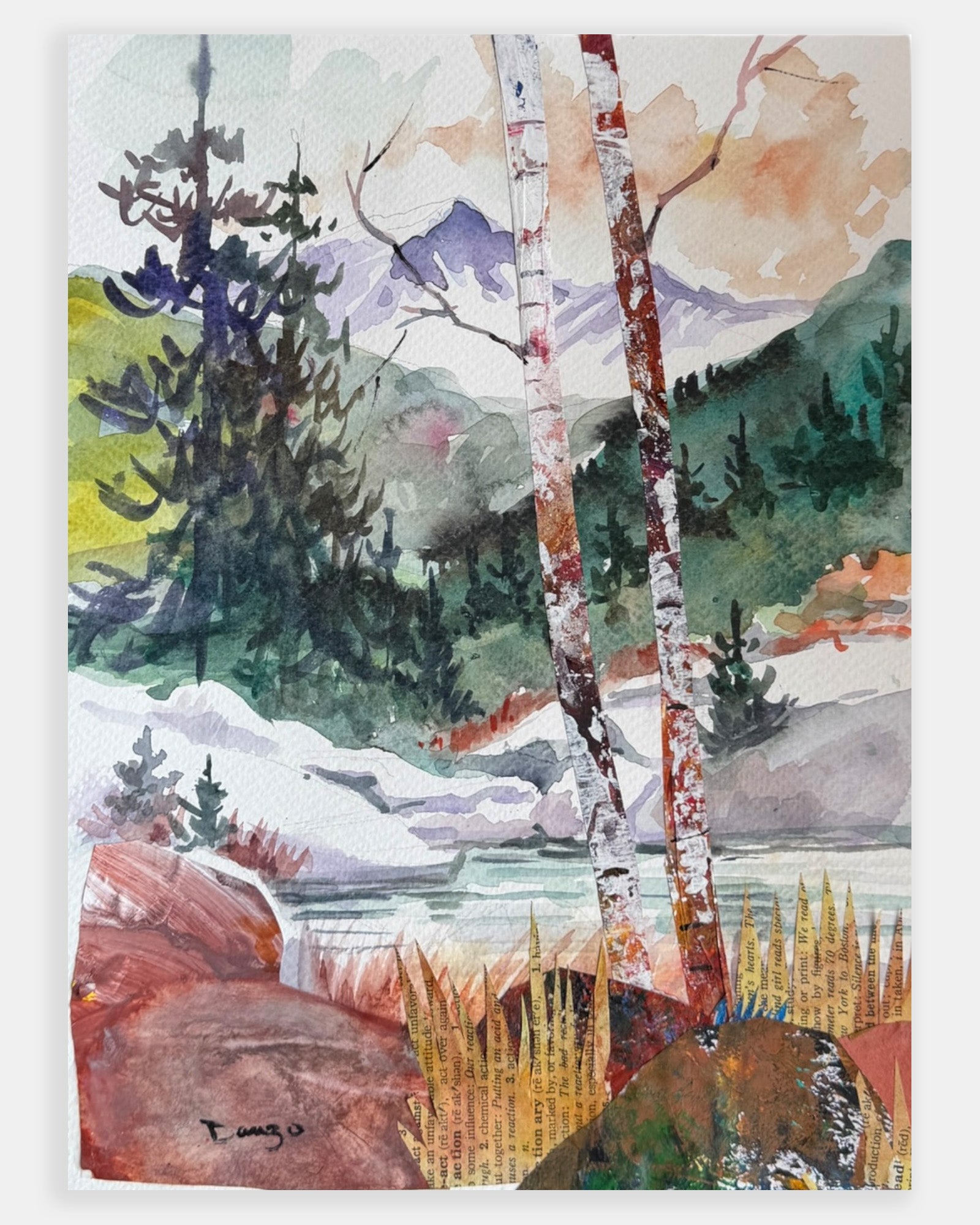 - medium: watercolor with mixed media collage on paper