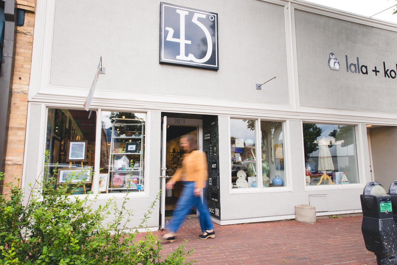 45º is a locally owned art gallery and custom frame shop in Old Colorado City. Founded by Reed and Emily Fair in 2010, it features a curated collection of fine art, including paintings, jewelry, pottery, furniture, and sculpture by over 30 Colorado artists. The gallery also offers a wide range of unique frame mouldings you won’t find elsewhere in Colorado Springs.