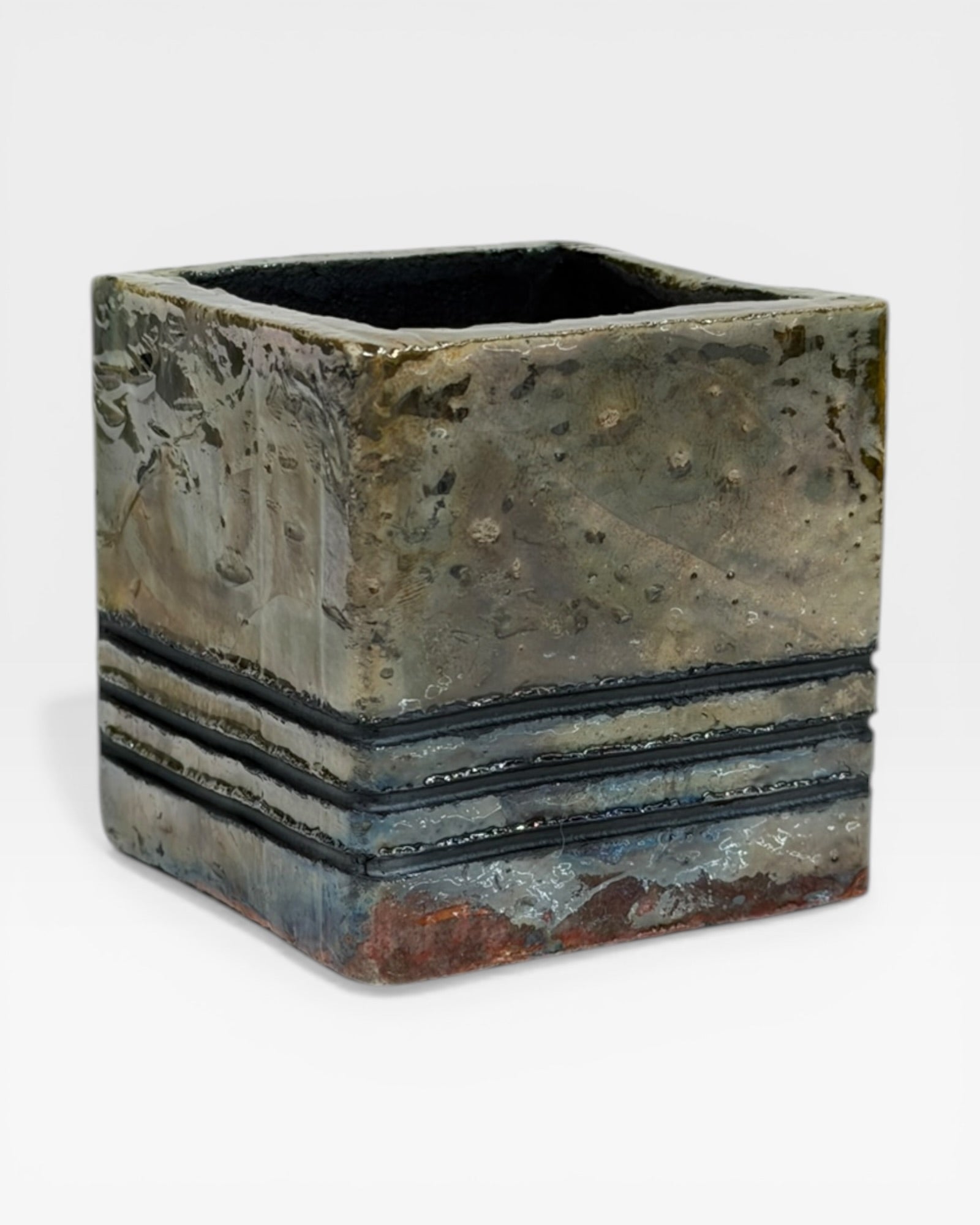 This piece is one of more than one hundred raku-fired ceramic wall cubes in Reed Fair's Connected collection — each shaped as much by fire and smoke as by intention. Raku is an unpredictable process, and Reed welcomes that unpredictability as a collaborator. What emerges is never entirely planned. These pieces resist uniformity, and that resistance is precisely what makes them alive.