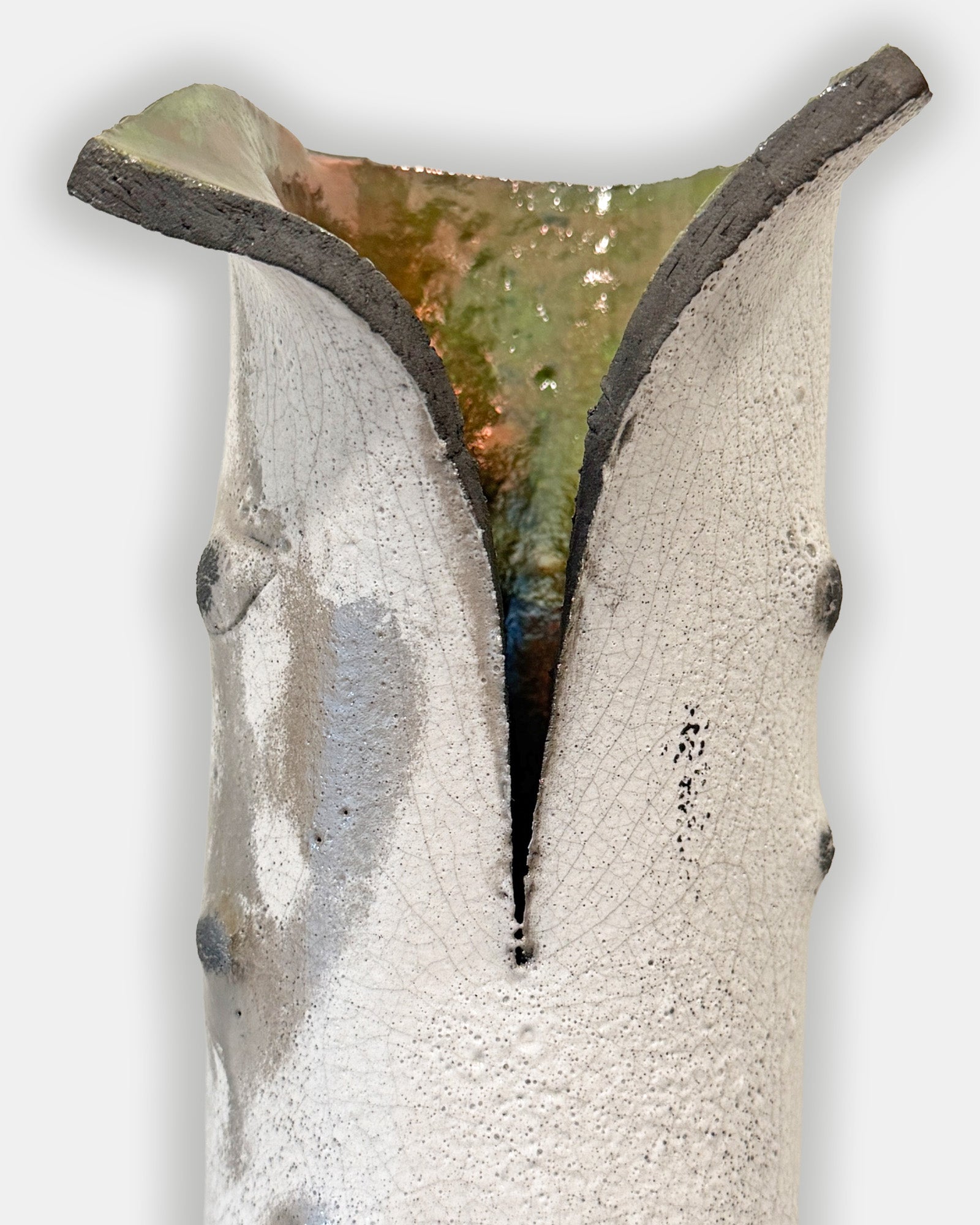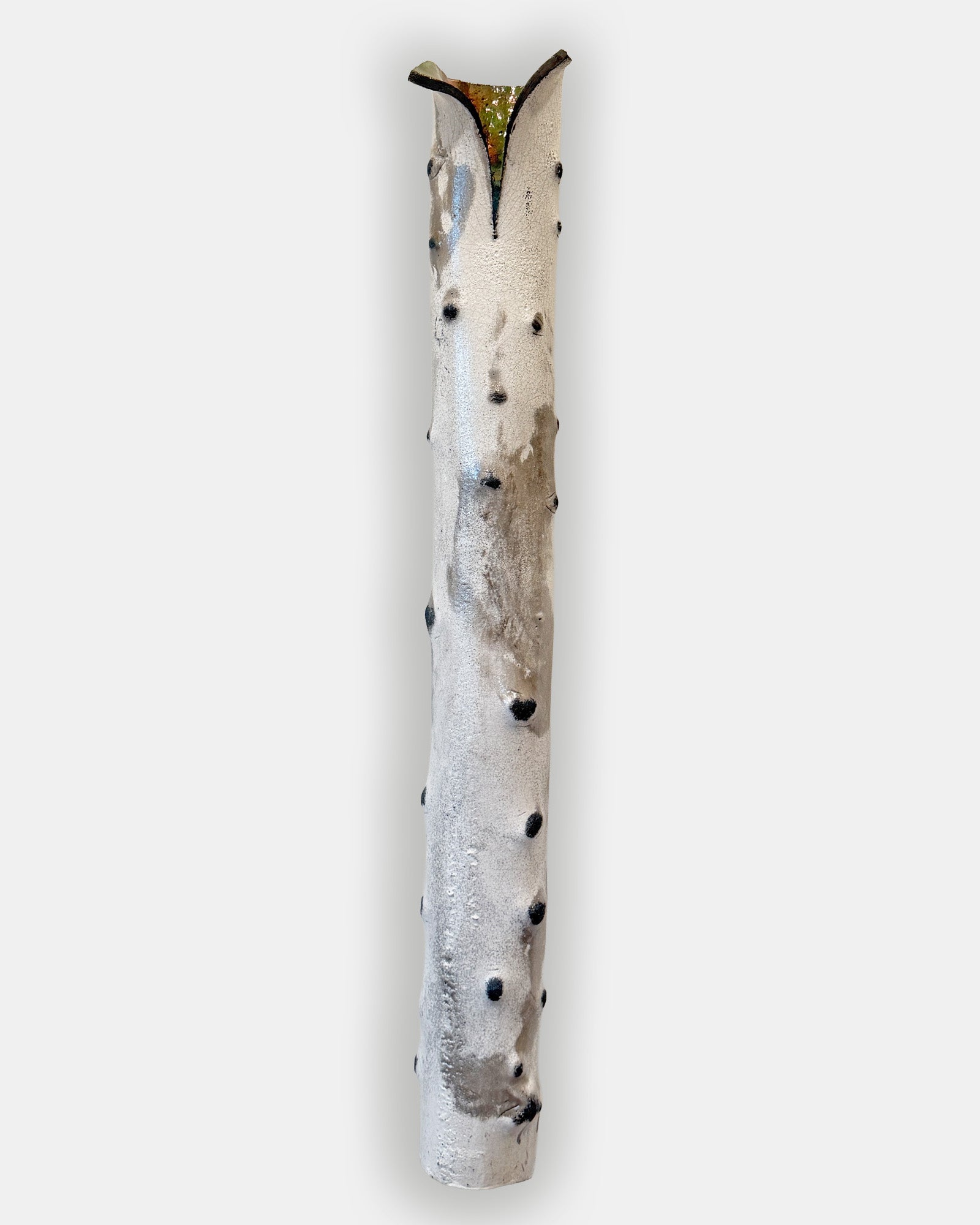The Grove Collection captures the quiet beauty of Colorado’s aspen groves through Reed Fair’s sculptural lens. Each piece begins as a tube of raku clay, shaped and textured to echo the natural rhythm of aspen bark. The top is cut and gently flared open, revealing a luminous, colored interior—an abstract nod to the vibrant leaves that crown these iconic trees.