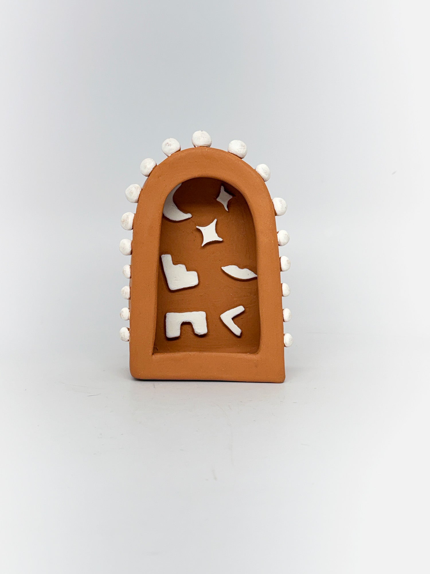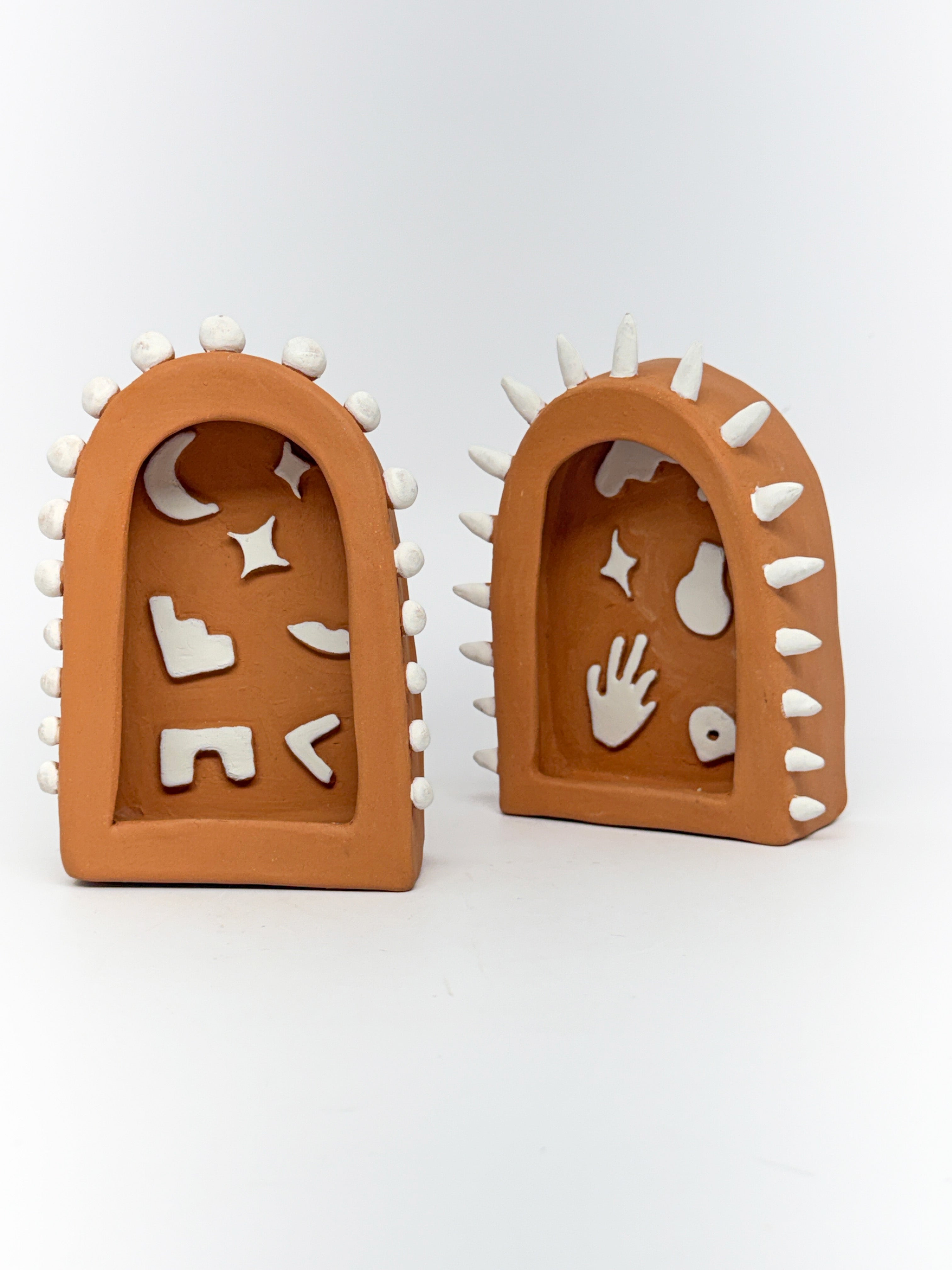 "Nichos" My adoration of Mexican folk art is often a clear inspiration in my work. After two of my best friends lost their moms to cancer in 2023, I began making altars as a place to put their grief. I found the concept of choosing items of remembrance and having them reflected back as a daily and visual reminder soothing and a small way I could offer comfort to my pained friends. That has led to a creative exploration over the past couple years and these are my latest and favorite renditions. They blend my style with traditional Mexican folk art elements of nichos and milagros as a mobile and visual place of remembrance.