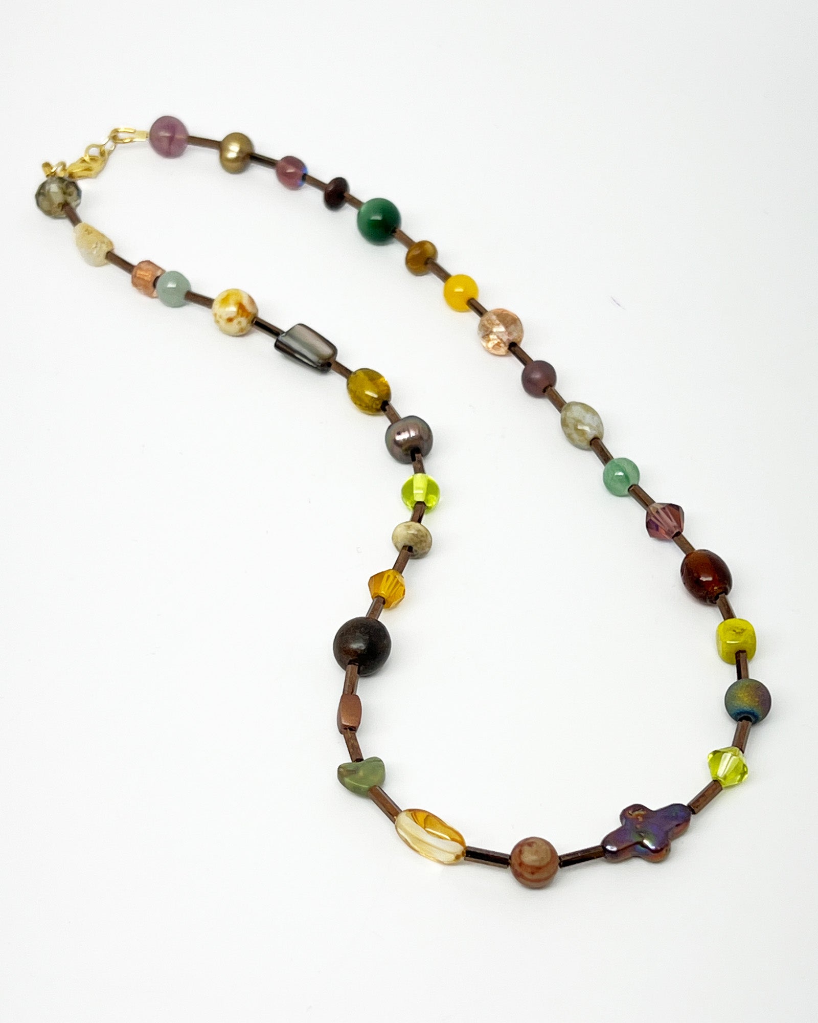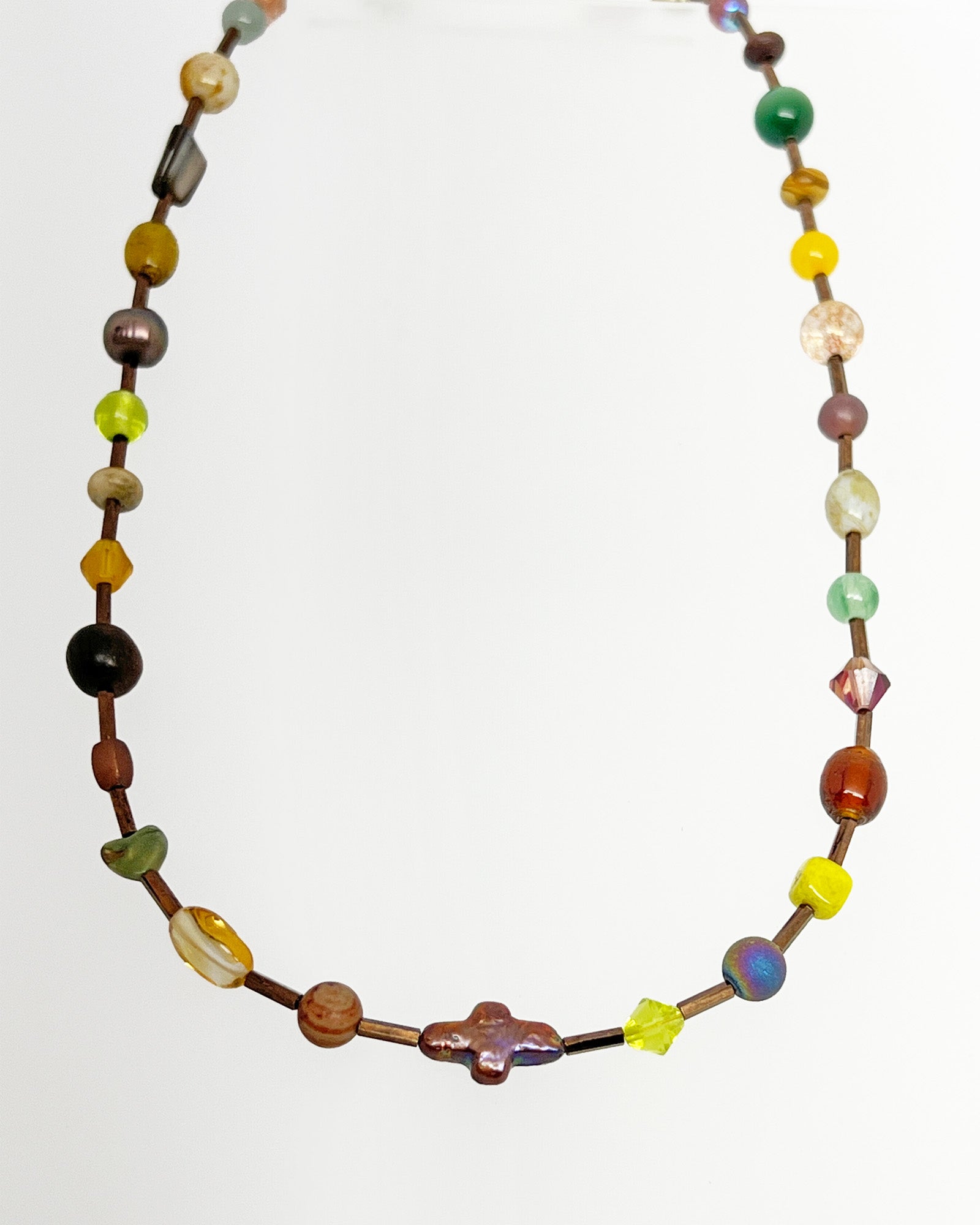 Party Down necklaces are made with glass bugle beads, and various beads from vintage hauls, new strands, and inherited beads from friends and family. Each strand is completely unique and while they may look alike, there are no two the same.