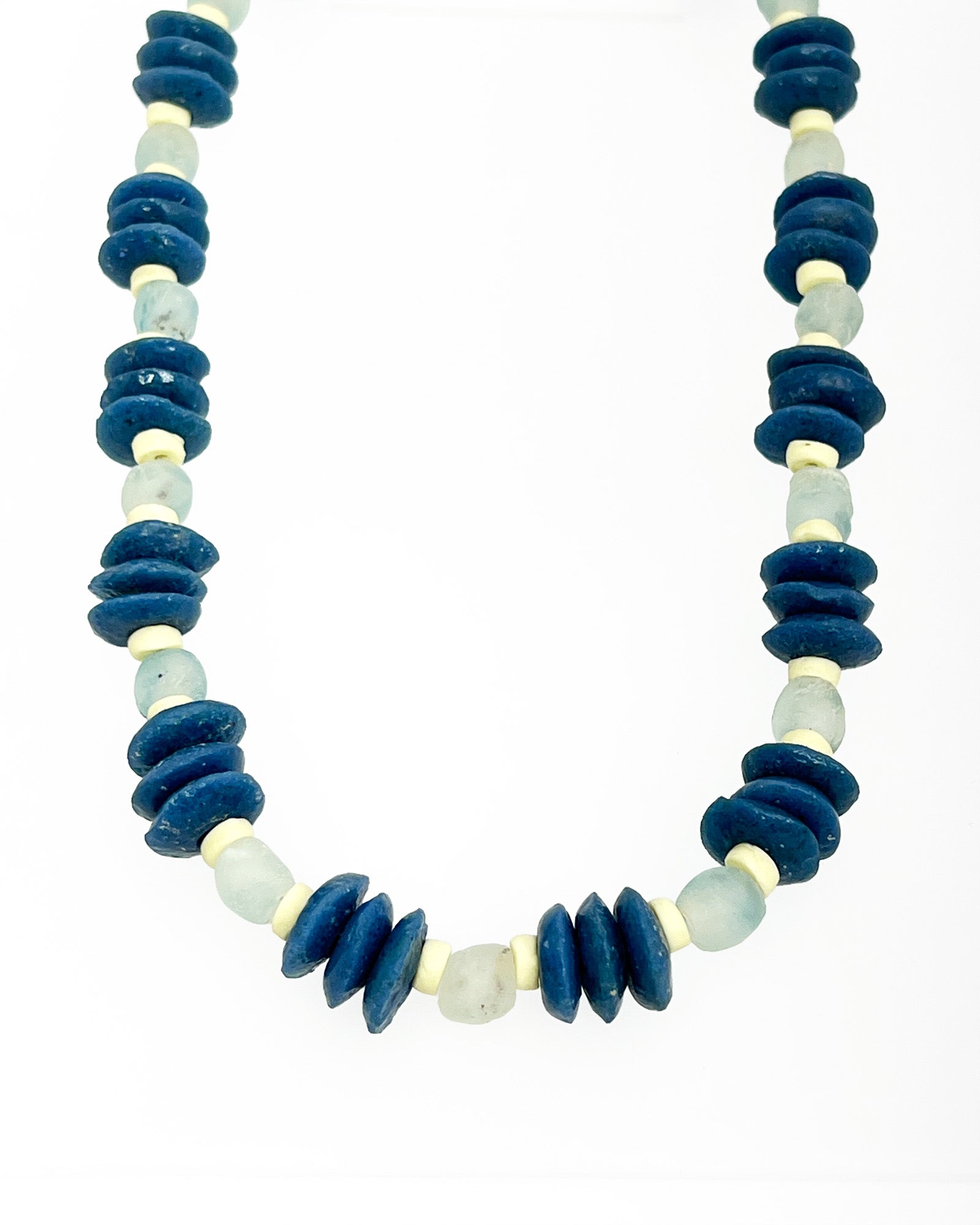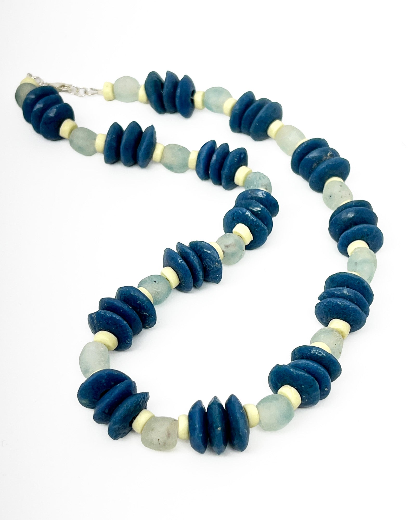 This strand is made with dark blue Sandcast beads, light blue, translucent Sandcast beads, small vintage cylinder glass beads from the Philippines, and small yellow porcelain beads.