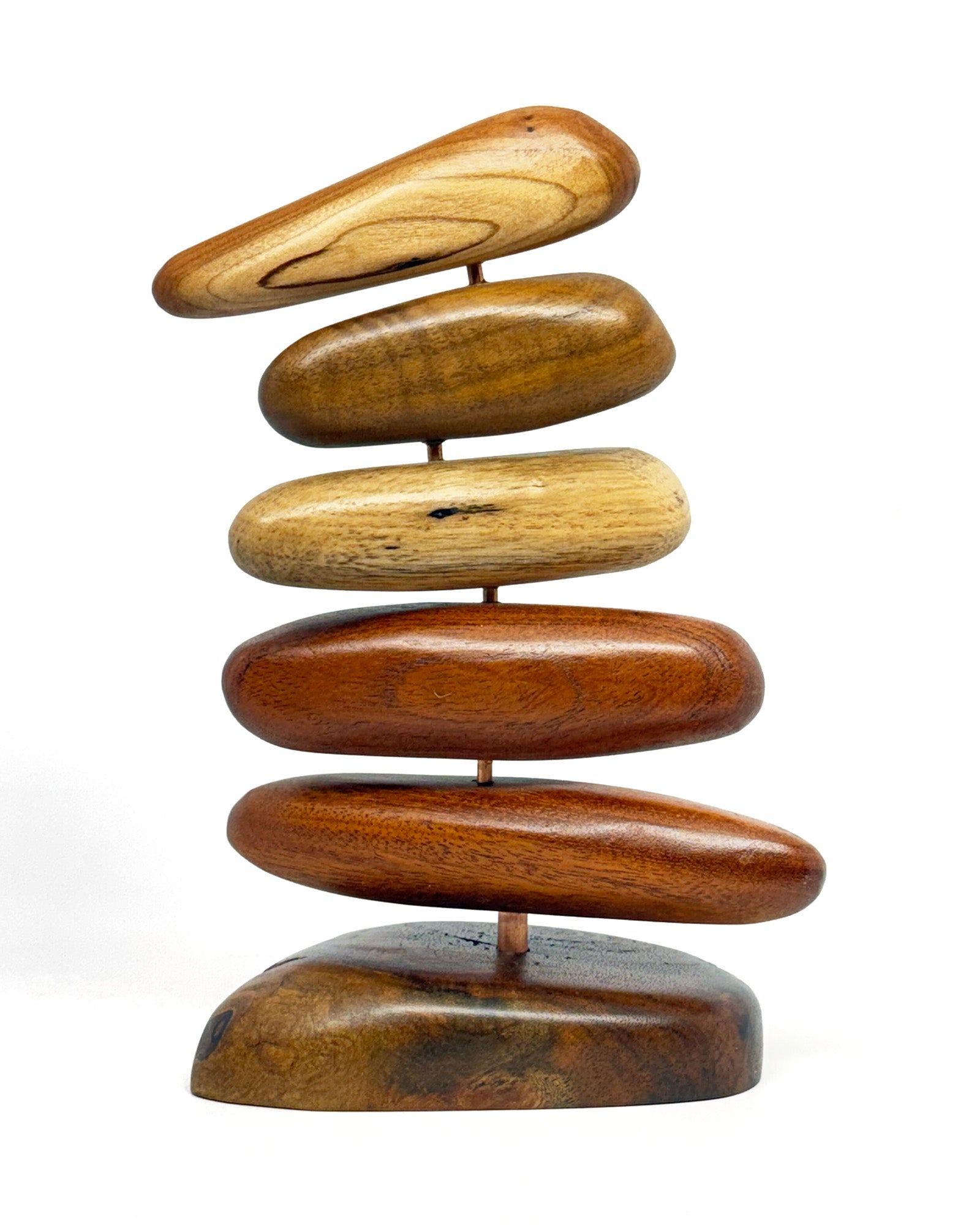 This striking wood sculpture by Colorado artist Jim Bradshaw showcases a balance of organic form and modern design. Smooth, tumbled rock shapes are carefully stacked to create a harmonious composition, revealing the rich tones and natural grain variations of multiple hardwoods.