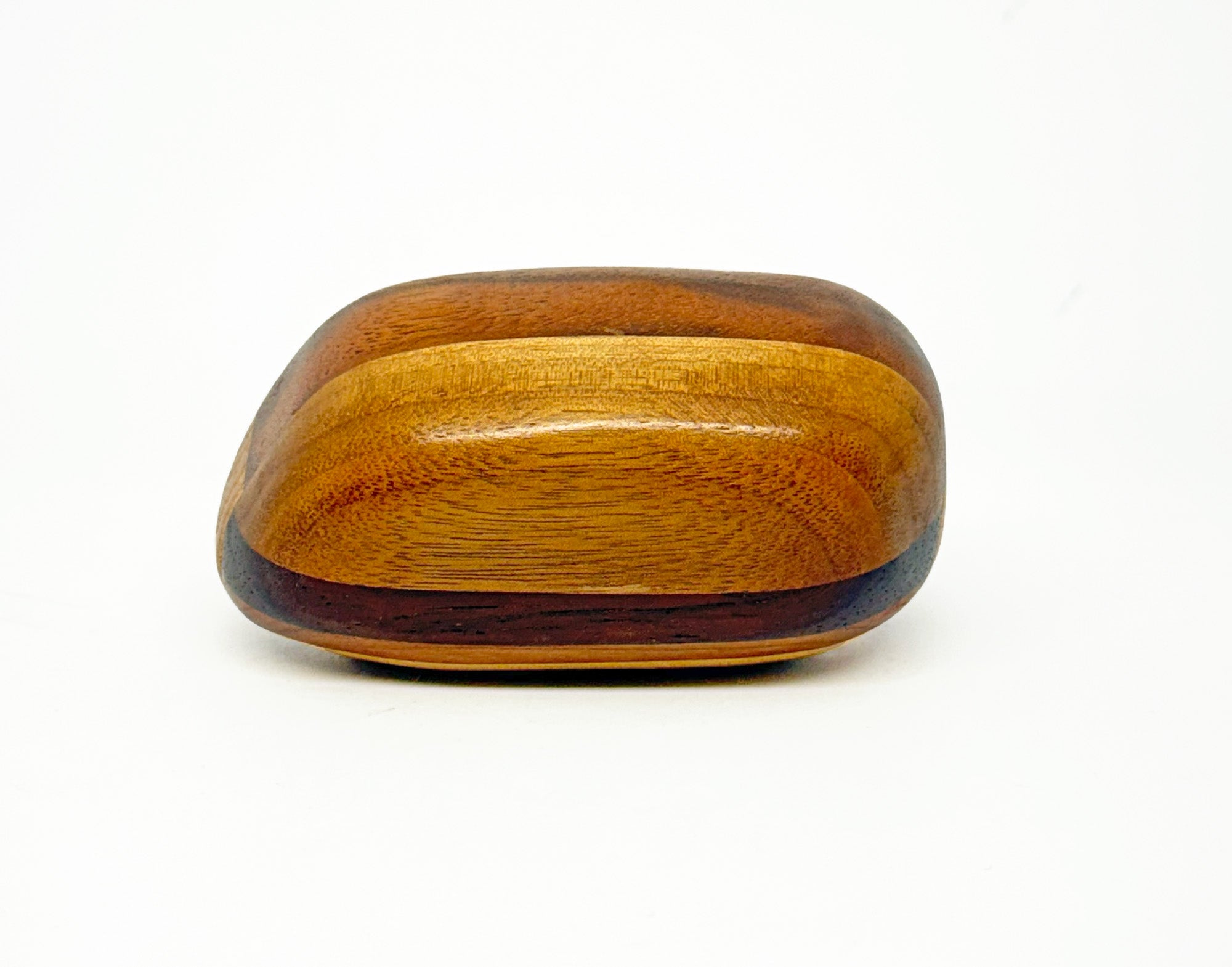 Inspired by the smooth, organic forms of tumbled river stones, Jim Bradshaw’s segmented wood sculptures bring together multiple hardwoods in layered harmony. Each piece is carefully shaped and polished to highlight the natural grain, tone, and texture of the wood, resulting in a surface that feels both timeless and contemporary.